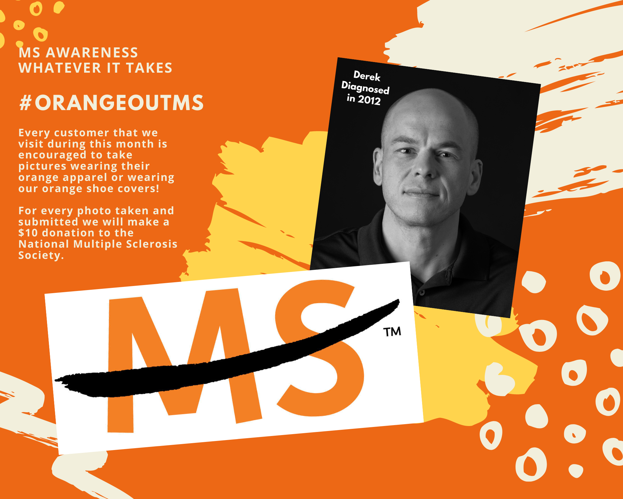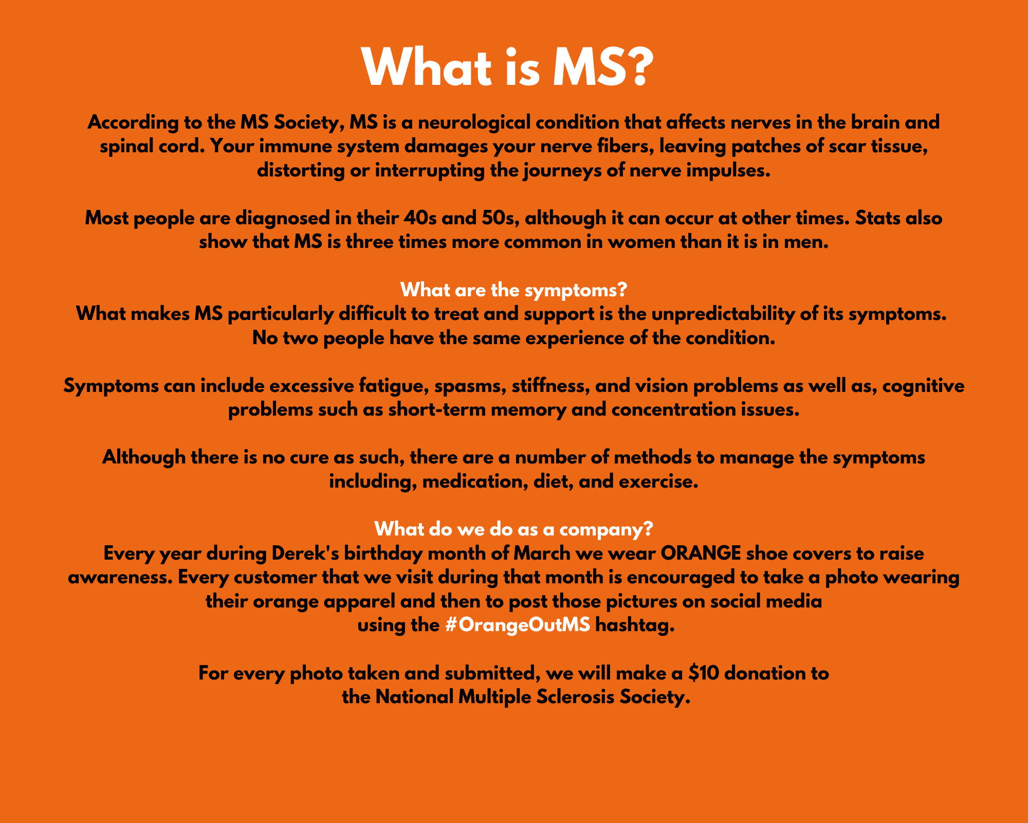 Every year during Derek's birthday month of March we wear ORANGE shoe covers instead of our signature YELLOW shoe covers to raise awareness. Every customer that we visit during that month is encouraged to take pictures wearing their orange apparel and post those pictures on social media using the #OrangeOutMS hashtag.